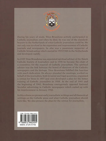 In 1935 Titus Brandsma was appointed spiritual adviser of the Dutch Catholic Society of Journalists and in 1936 he became the chair of a committee for the renewal of Catholic journalism. The spiritual adviser was the link between the board of directors of the Catholic newspapers and the bishops. Titus Brandsma fulfilled this function with much dedication. He always attended the meetings, worked on behalf of the journalists, both in social and legal questions, organised a retreat for them in 1937 and even developed a plan for the better training of Catholic journalists in 1938. At the end of 1941 and the beginning of 1942, Brandsma courageously opposed National Socialist advertising in Catholic newspapers which ended up with his imprisonment in January 1942.
